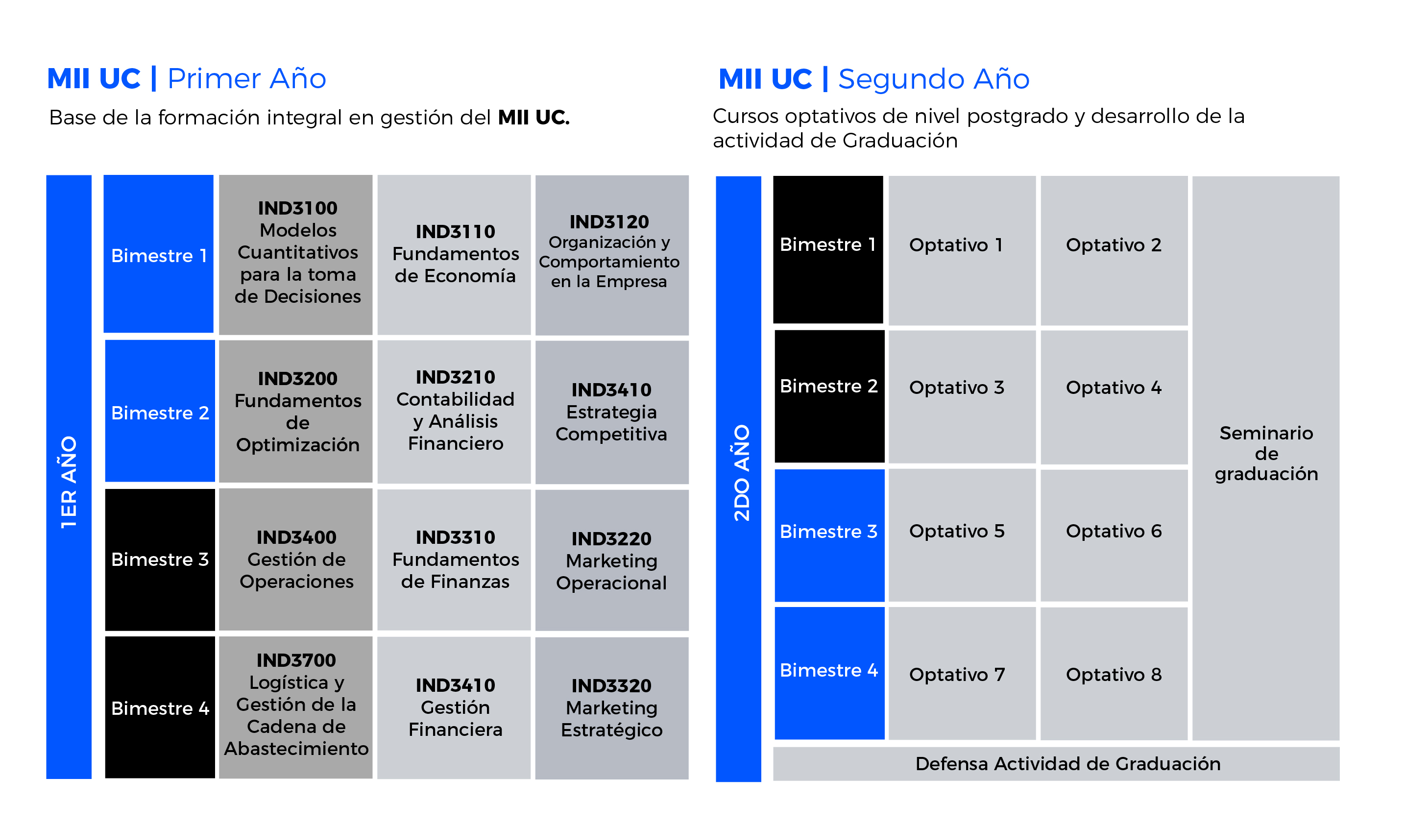 Descubre el MII UC, un programa de dos años con una estructura bimestral que te ofrece flexibilidad y una experiencia de aprendizaje enriquecedora. Cada curso bimestral consta de ocho sesiones de clases, seguidas de una sesión para el examen o trabajo final del curso.